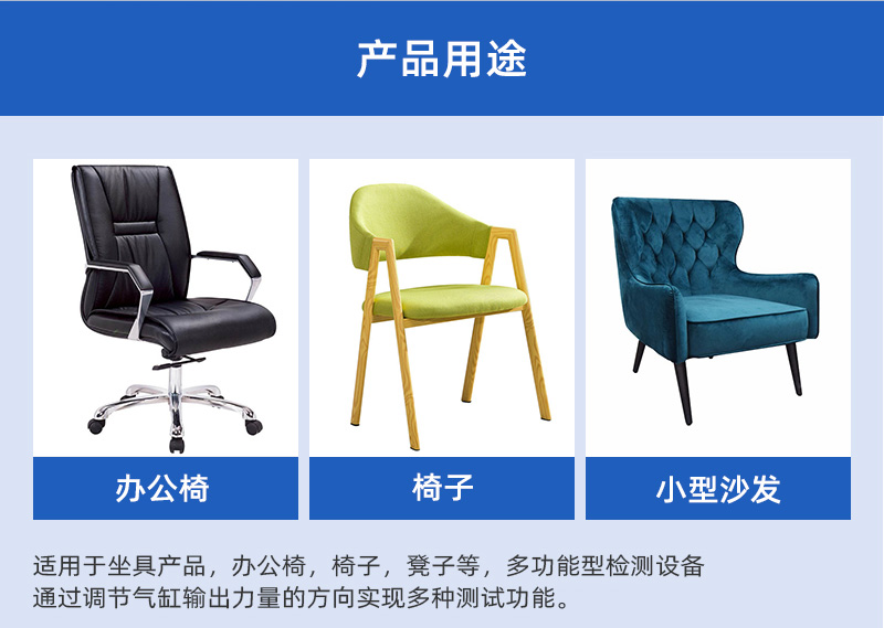 本試驗機模(mó)擬辦公椅的使用情況,測(cè)試椅(yǐ)子扶手(shǒu)結構抵受垂直壓(yā)力和(hé)重複荷載壓(yā)力的能(néng)力(lì),此荷(hé)載可以看做作是離開(kāi)座位時(shí)把扶手作為支撐而(ér)產生的(de)力。除扶手測試外,本機 還(hái)可以用(yòng)於椅腳強度測試和腳踏耐用性測試。 Bifma x 5.1 clause 18 Leg strength test (椅腳強度) Clause 19 Footrest static load test – vertical(腳踏測試-垂直(zhí)) Clause 20 Footrest durability test – vertical-cyclic(腳踏測試垂直環) Clause 21 Arm durability test – cyclic (扶手耐用性循環(huán)測試) | ||