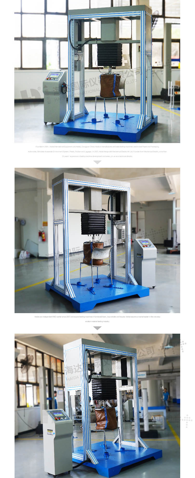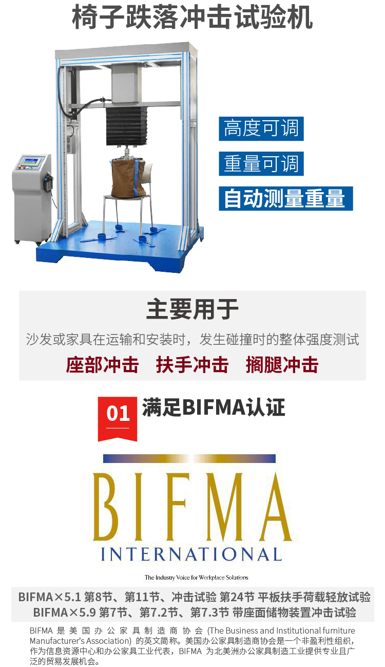 辦公椅衝擊試驗機是一項綜合性能測試(shì)項目,評估椅麵在垂直力作用下的承受能力。 設計標準(zhǔn):Bifma×5.1 第(dì)8節、第11節、衝擊試(shì)驗 第24節 平板扶手荷載輕放試驗 Bifma×5.9 第7節、第7.2節、第(dì)7.3節(jiē) 帶座麵儲物裝置衝擊試驗 | ||