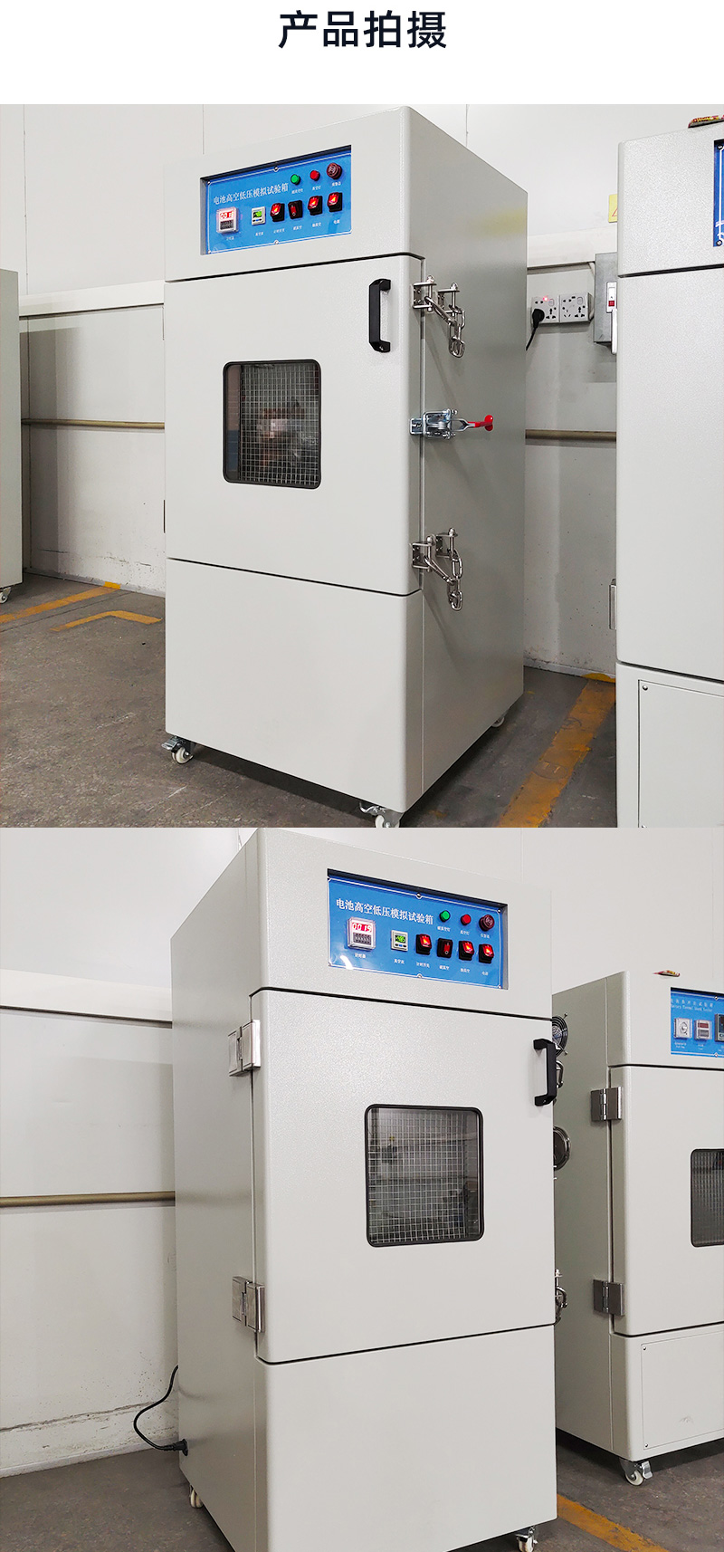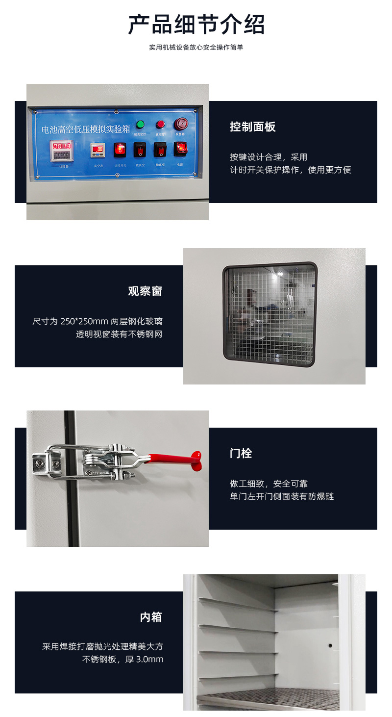 1內箱材質: SUS201# 不鏽鋼,厚度3mm; 2、外箱材質: A3 冷板烤漆, 厚度(dù)1.5mm; 3、壓力範圍: 0.5~100Kpa,常(cháng)用測試氣壓(yā)11.6 Kpa; 4、內箱尺寸(cùn): W400xH400xD400mm 5、外箱尺寸: W550xH1200xD550 6、置物隔板材質:不鏽鋼; 7、真(zhēn)空度顯示:數顯式真空表控製,準確顯示真空度,易(yì)於設置真空度; 8、計(jì)時器: LED數(shù)顯, 在0-9999H內自(zì)由(yóu)設置(zhì)可(H/M/S秒可切換); 9、 壓(yā)力波動:≤5%; 10、 設備使用電源:AC220V,50HZ,2.2KW; | ||