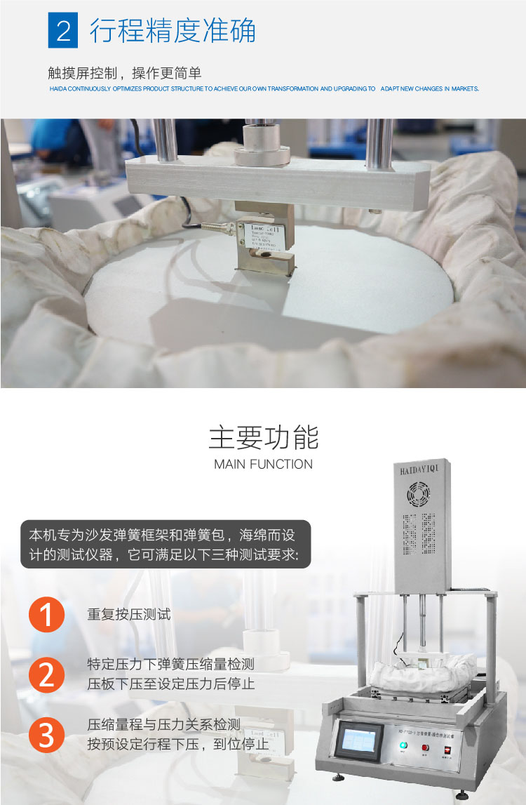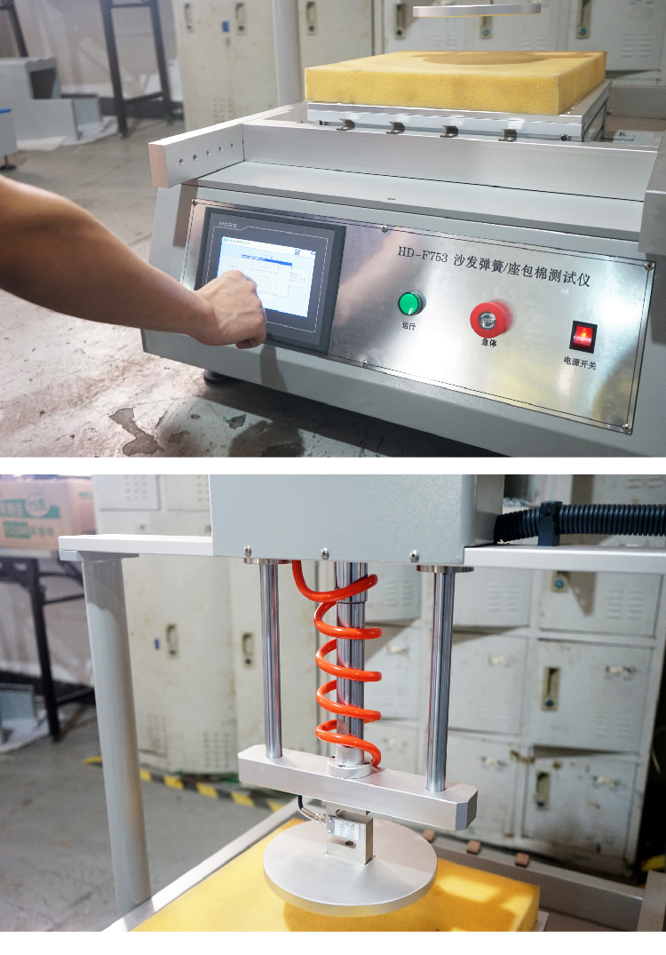 沙發彈簧測試儀用於測試沙發及家具坐(zuò)墊的彈簧框架及彈簧包和彈簧坐墊的耐久性(xìng)和承受力。可按預設定之壓力條件進行重複按壓測試,周期可預設定,到(dào)數自(zì)動停止。 | ||