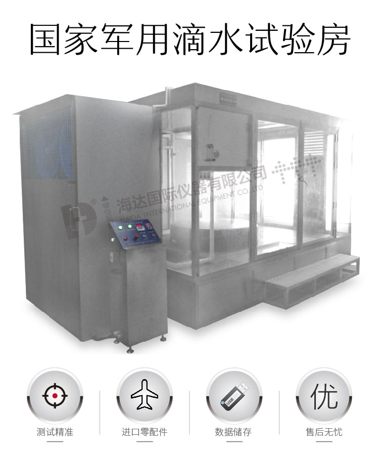 滴水試(shì)驗房適用於考核電工產品,外殼和密封在淋雨環境下能否(fǒu)保證設備和元件良(liáng)好性能的試驗。本產品采用科學設計,使得該設備(bèi)能夠逼真的模擬滴水環境。 設計標準:IP GJB150.8A-2009 標準之程序III | ||