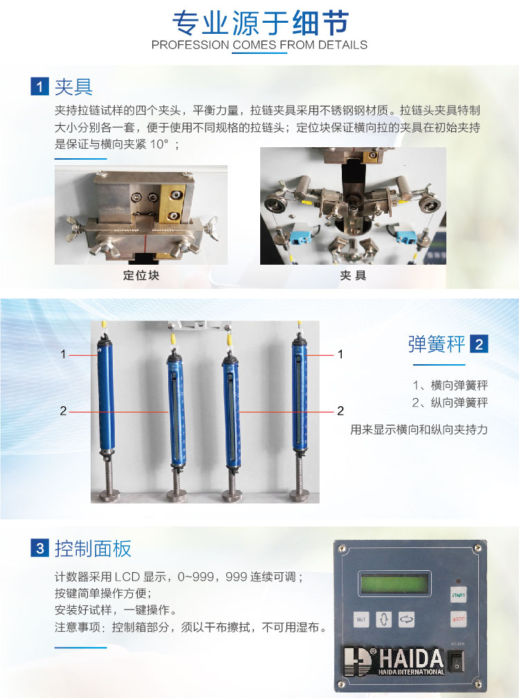 試驗拉鏈於橫(héng)向及(jí)縱向張力之作用下,能否承受規定次數(shù)之往(wǎng)複拉動操作,試驗時本機以等速帶(dài)動拉鏈之拉頭, 做每分鍾(zhōng)30次之往複運動(dòng),至規定之次數為止(zhǐ) 設計標準:CNS-1083 |