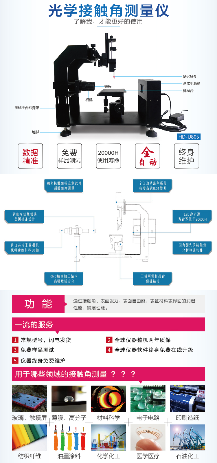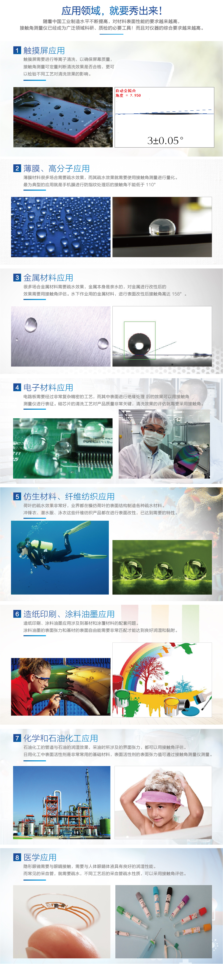 水滴角測試儀用於測試液體對固(gù)體的接觸角,即通(tōng)過測量液(yè)體與固體間所形成接觸角的(de)大小,判(pàn)斷液體對固體的浸潤性。廣泛應用於(yú)矽晶、液晶、玻璃(lí)、纖維、合成材料(liào)、油墨、塗(tú)料、農藥等領域的測試與研究。 |