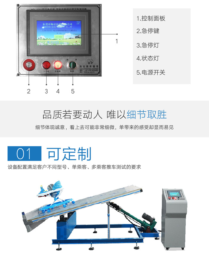 嬰兒車穩定性(xìng)測試性測試平台通過穩定性模擬測試,判斷嬰兒車台穩(wěn)定性(車台不得(dé)翻覆.測試時,任何提籃或座椅的附屬部(bù)件都不得與(yǔ)車架分離. | ||