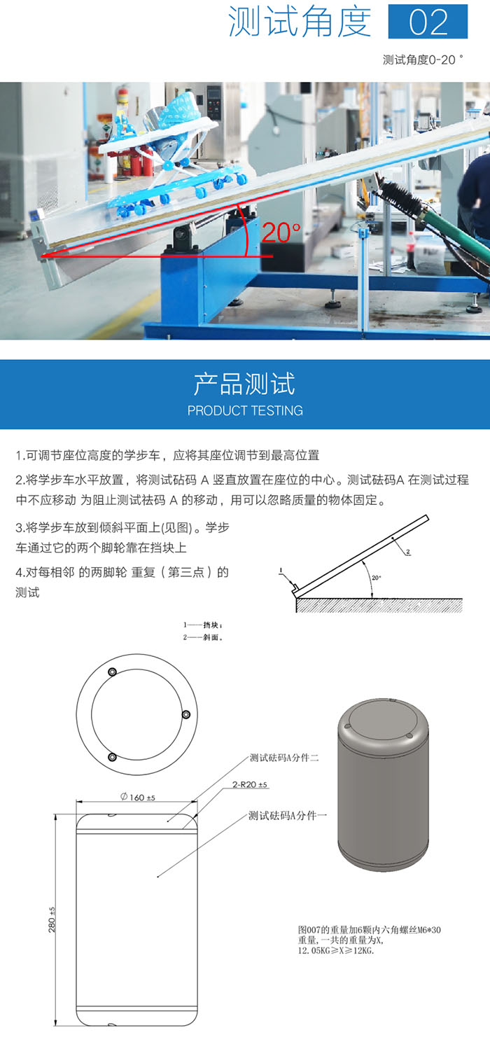 1.測(cè)試台麵積:1.0 M*1.5M 2.測試台表(biǎo)麵:PH80金鋼砂紙 3.測試台(tái)可傾斜角度:15º-0º-15º可調 4.角度顯示:觸摸屏顯示角(jiǎo)度 5.調節方(fāng)式:電動 6.正常工作動力:AC220V/50HZ 7.荷 重:25kg±0.2kg、50kg±0.2kg 8.機台尺寸(cùn)(約):1.6M*1.3M*0.9M(W*D*H) 配件 1、傾斜角度:0-12° (前傾和後傾) 2、傾斜台表麵覆(fù)80砂紙 3、擋(dǎng)塊截麵積為25×25mm,高度可調與車輪軸(zhóu)等高(gāo) 4、測試(shì)砝碼(mǎ):A 砝碼和(hé)B 砝碼 | ||