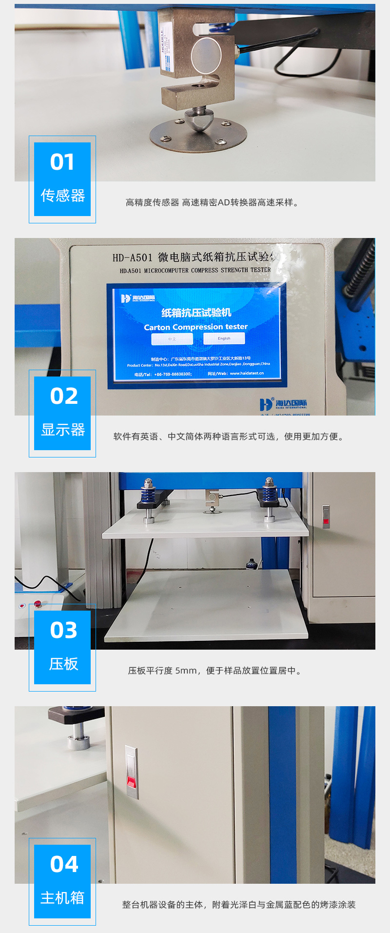 微(wēi)電腦式(shì)紙箱抗壓試驗機HD-A501-900是檢驗紙箱或其它包裝容器(qì)耐壓強度最直接的測試儀器,用於判定紙箱的抗壓能力,並可(kě)做持(chí)壓堆碼的測試,試驗的結果(guǒ)可作為工廠堆放成品包裝箱高度的(de)重要參考或是設計包裝箱的重要依(yī)據。適用於瓦楞紙(zhǐ)箱、蜂窩板箱等包裝件的耐壓、形變、堆碼試驗。並兼(jiān)顧塑料桶(食用油、礦泉水)、紙桶、紙盒(hé)、紙罐、集裝容器桶(IBC桶)等容器的抗壓試驗。