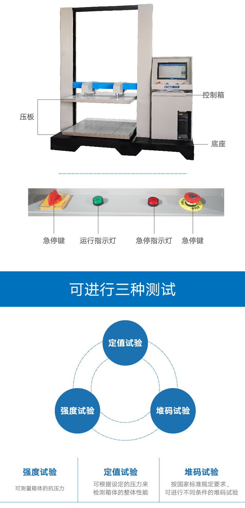 計算機伺服紙箱(xiāng)抗壓試驗機HD-A505S-1200是檢驗(yàn)紙箱或其它包裝容器耐壓(yā)強(qiáng)度最直接(jiē)的測(cè)試儀器,用於判定紙箱的抗壓能力,並可做持壓堆碼的(de)測試,試驗的結果可作為工廠堆放(fàng)成品包(bāo)裝箱(xiāng)高度的重要參考或是設計包(bāo)裝箱的重要依據(jù)。適用於(yú)瓦楞紙箱、蜂窩板箱等包裝(zhuāng)件的(de)耐壓、形變、堆碼試驗。並兼顧塑料桶(食用(yòng)油、礦泉水)、紙桶(tǒng)、紙盒、紙罐、集裝容器桶(IBC桶)等容器的抗壓試驗。 設計標準:TAPPI-T804,JIS-20212,GB4857.3.4, ASTM-D642, QB/T1048, BS EN ISO 12048, GB/T4857.16, GB/T8167, GB/T8168, GB/T4857.3,GB/T4857.4 | ||
