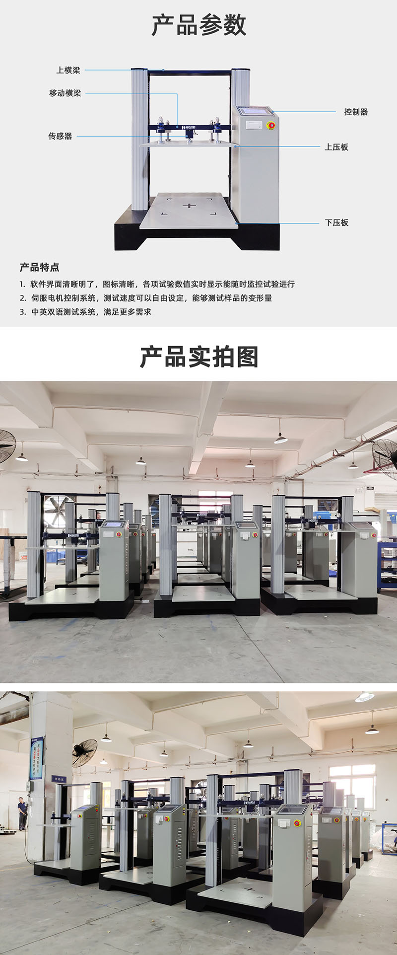 | 1.容量選擇10KN傳感器 2.測試空(kōng)間約700mm×900mm×900mm(L*W*H) 3.壓縮行程(chéng)0mm~900mm(H) 4.外形尺寸(cùn)約1210mm×900mm×1425mm(L*W*H) 5.升降速度0.1~200mm/min 6.荷重分解度(dù)1/250,000 7.荷重精(jīng)度≤±0.5% 8.電 機400W伺服電機 9.驅動器400W伺服驅動器 10.絲 杆滾珠絲杆 11.報表(biǎo)項目序號、峰值、平均值、設定持壓值、持壓時間 12.單位切換gf/kgf/N//kN/Ibf/T 13.報表輸出Windows模式輸出、Office模式輸出(chū)、熱敏打印機輸出 14.控製方式電腦控製(zhì),windows模式操作 觸(chù)摸屏控製 15.重 量約350kg 16.電 源1∮ AC 220V 17.整機功率約(yuē)500W 18.主要(yào)測試項目紙箱抗壓試驗、紙箱(xiāng)堆碼試驗 | ||